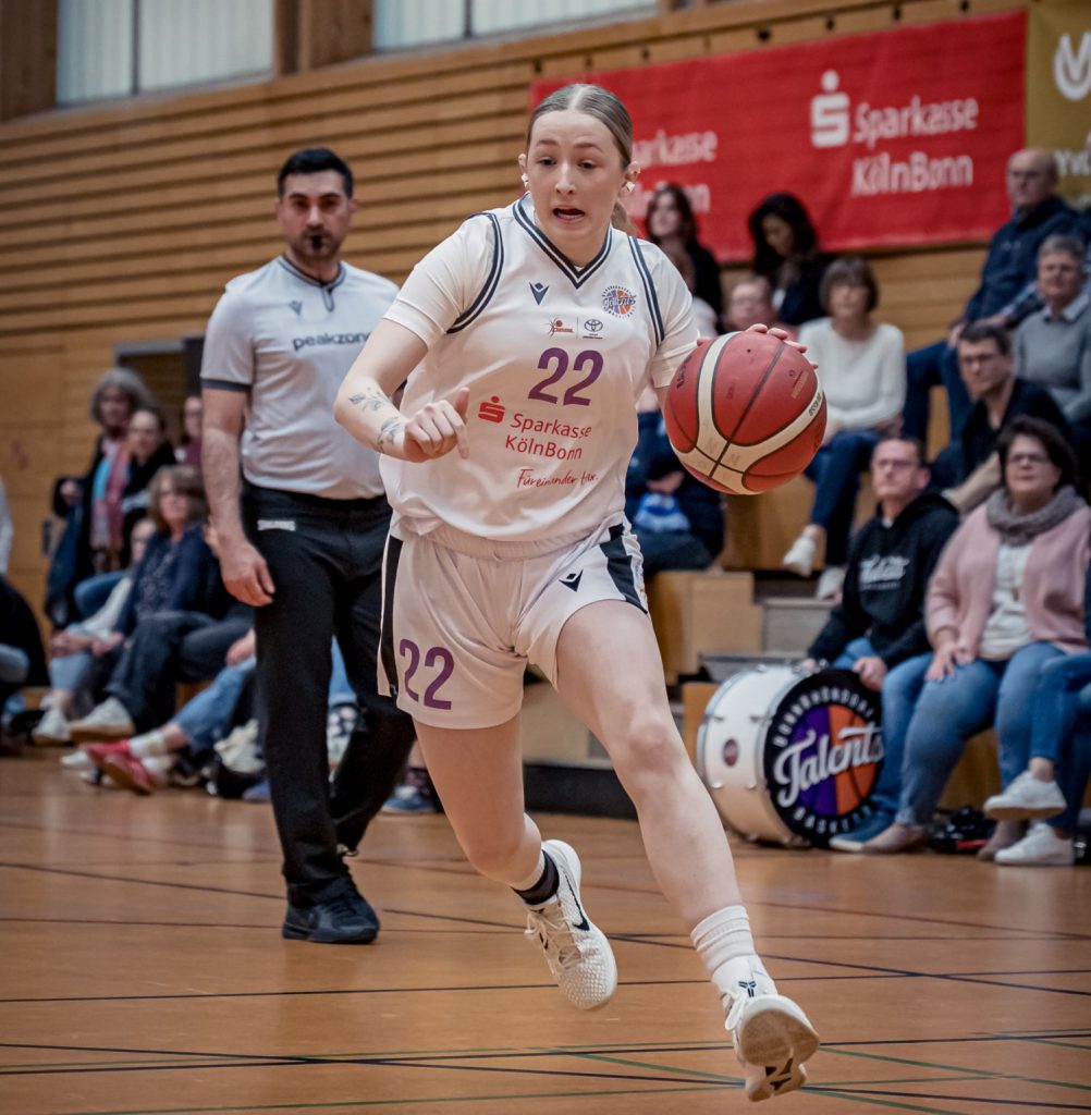 Zur Halbzeit lagen die Gastgeberinnen vor vollen Tribünen in der Elisabeth-Selbert-Gesamtschule bereits mit 42:26 in Führung und hatten siebenmal von jenseits der 6,75 Meter entfernten Dreierlinie vollstreckt. Da hatte sich auch 1,93 Meter Centerin Sophia Müller ein Herz genommen und „for three“ gepunktet. Die Talents-Bank wusste den „höchsten Dreier“ der BonnRhöndorfer Saison entsprechend zu feiern.