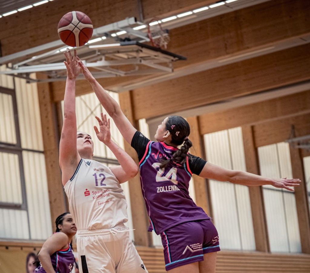 Wie zwingt man einen ungeschlagenen Spitzenreiter, der zudem mit fünf (!) Importspielerinnen antritt in die Knie? Auf jeden Fall darf man es nicht auf einen offensiven Schlagabtausch ankommen lassen. Die Veilchen Ladys kamen mit der Empfehlung von im Schnitt mehr als 83 erzielten Punkten in den Bonner Süden. Einen Dreier-Shootout gewinnt man gegen die distanzwurfstarken Niedersächsinnen bestimmt nicht. Also musste ganz viel Sand ins Göttinger Getriebe gestreut werden. Je weniger Punkte zugelassen werden, desto besser für die Talents, die mit Martha Middeler (15 Punkte/13 Rebounds) und Lia Hilgenfeld (14/9) zudem zwei wirkungsvolle Stachel im Göttinger Fleisch positionieren konnten.